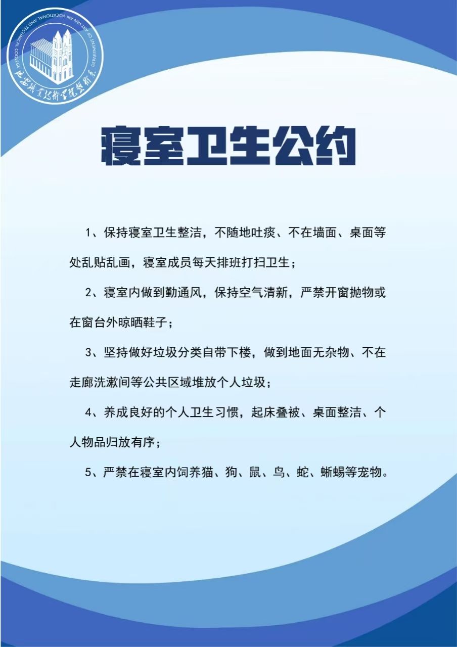 为培育艺术学子的爱校情怀与集体意识,营造和谐温馨的寝室氛围,提升“自我管理、自我服务、自我成长”的实践能力,摒弃不良习惯,共筑文明空间,打造促进专业学习和身心成长的温馨环境,现制订学生寝室文明公约, 望全体同学共同遵守。