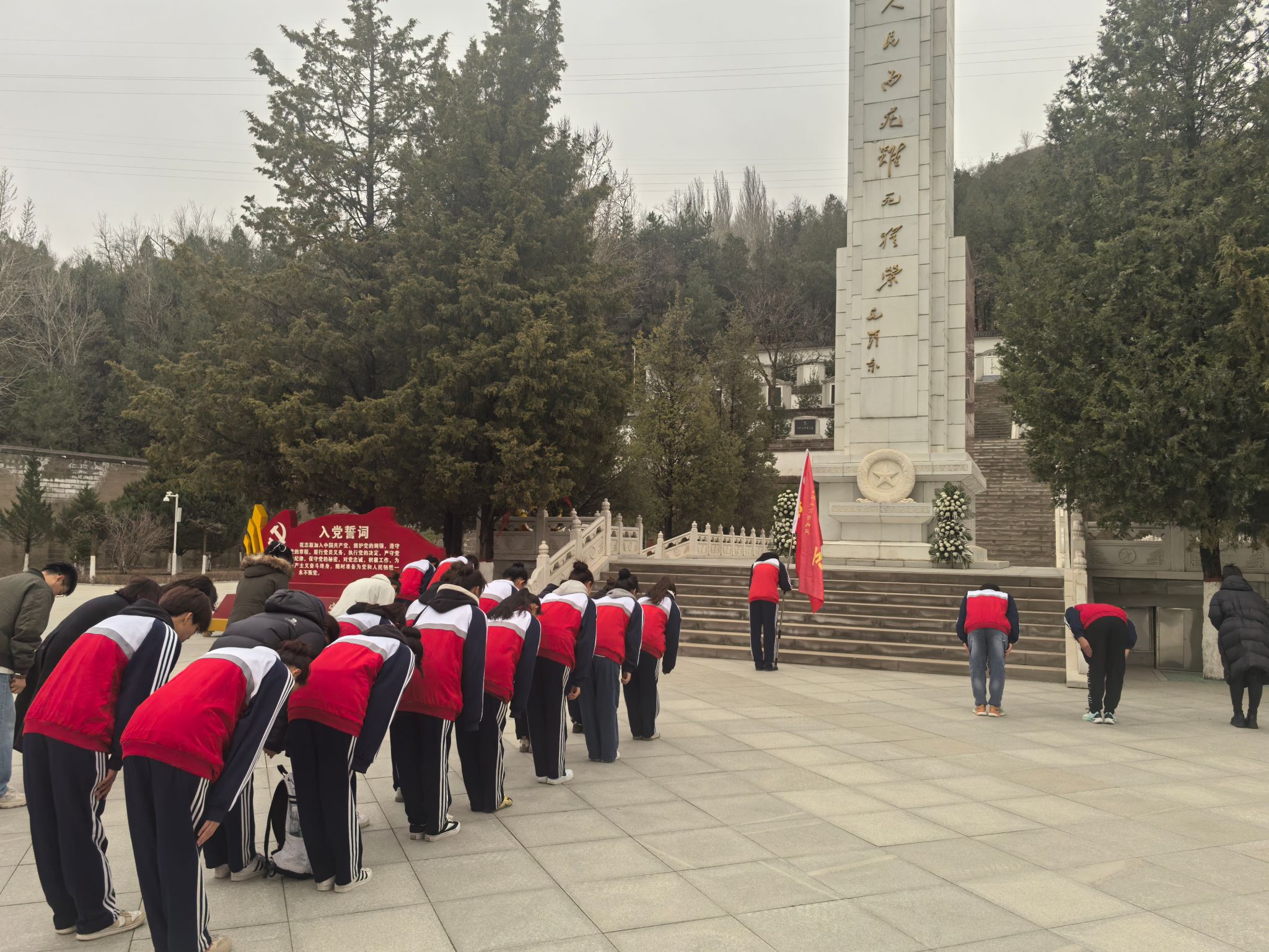 活动伊始,全体人员于纪念碑前列队肃立。讲解员阐明活动意义,强调革命先烈为民族解放与复兴作出的不朽贡献。学生代表庄严敬献花篮,全体师生静默肃立、垂首默哀三分钟,以无声的敬意追思先烈英魂。